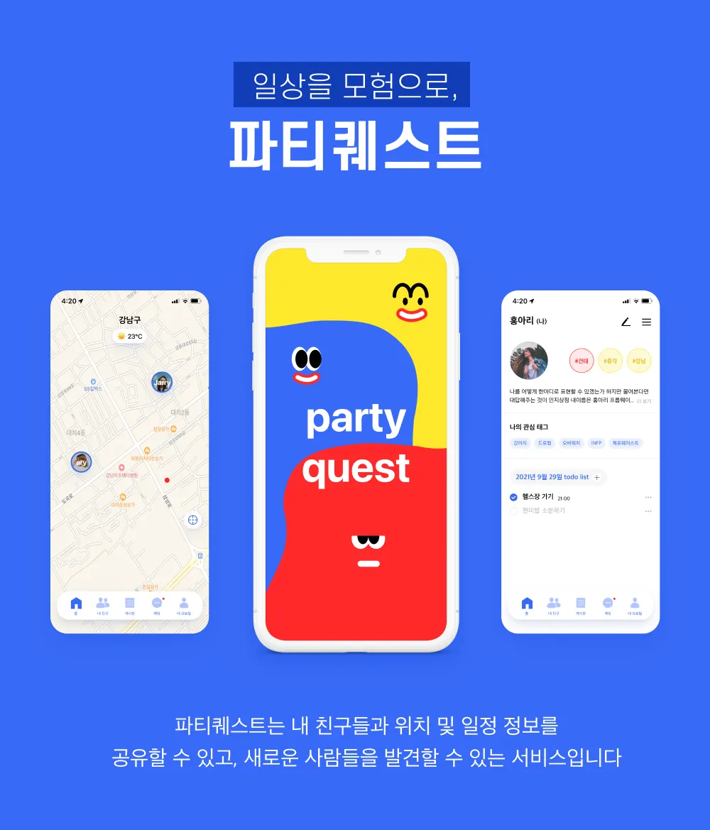파티퀘스트는 내 친구들과 함께 자유롭게 메시지를 주고받고, 일정과 위치를 확인할 수 있는 서비스입니다. 서로 일상을 공유하면서, 주최측이 내는 '퀘스트'를 함께 해결하세요.